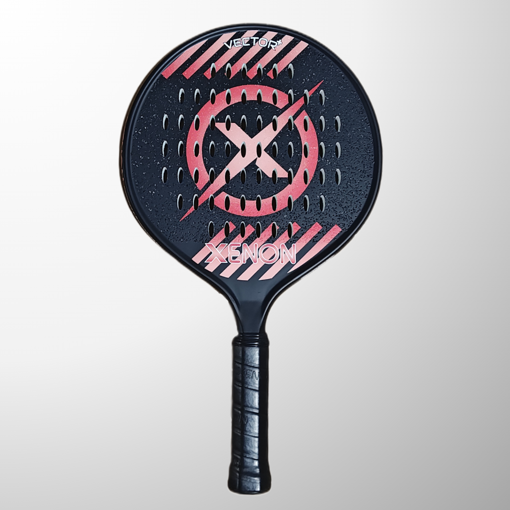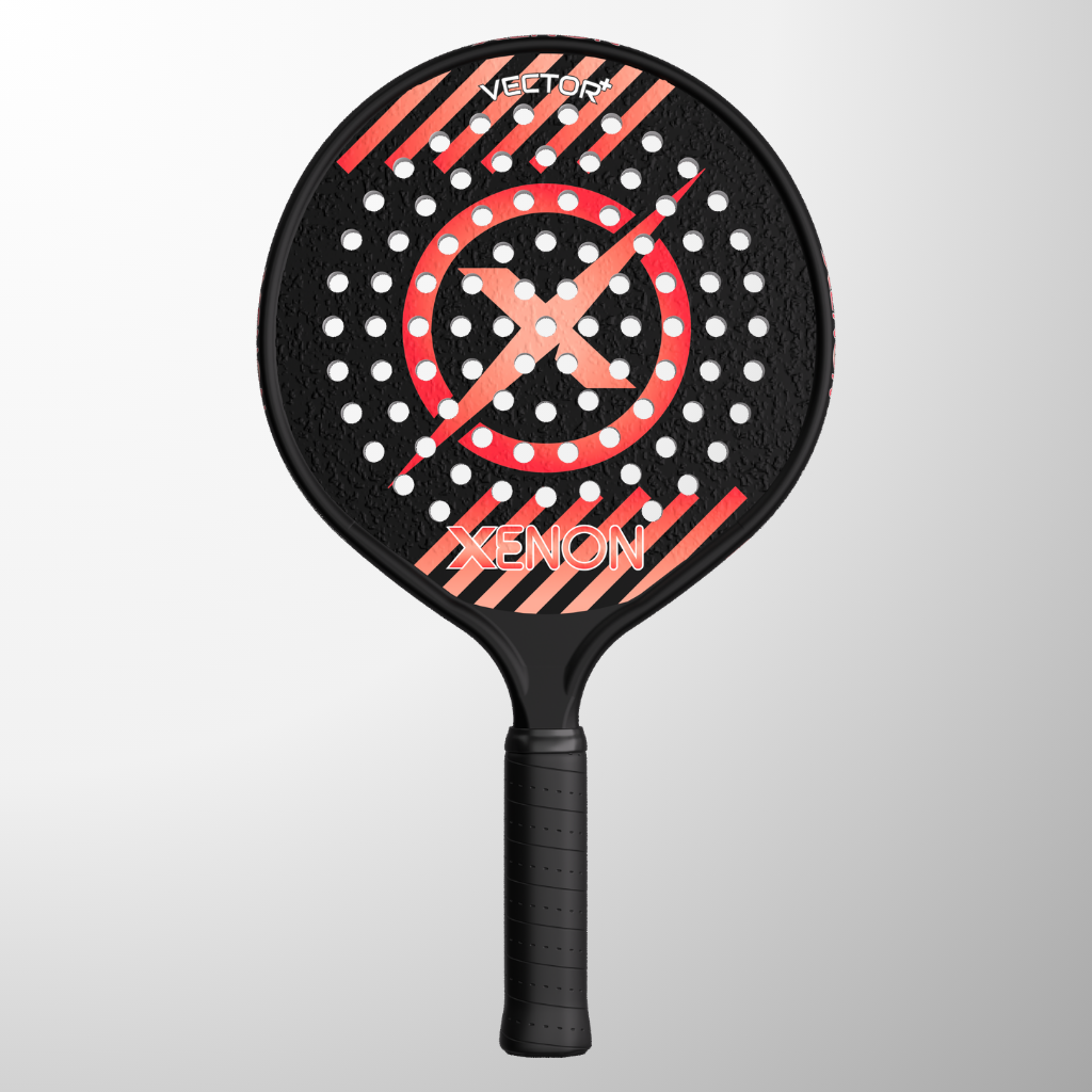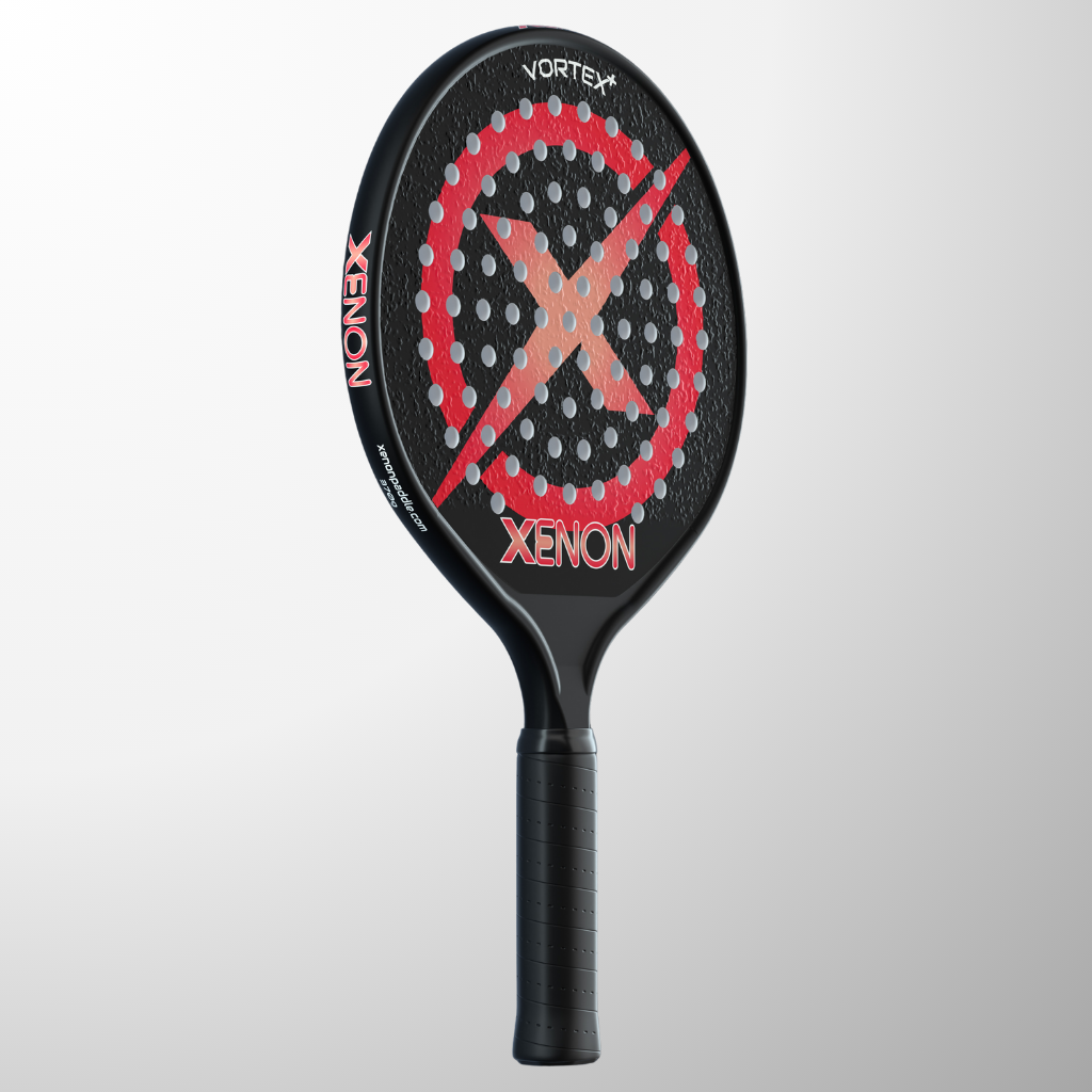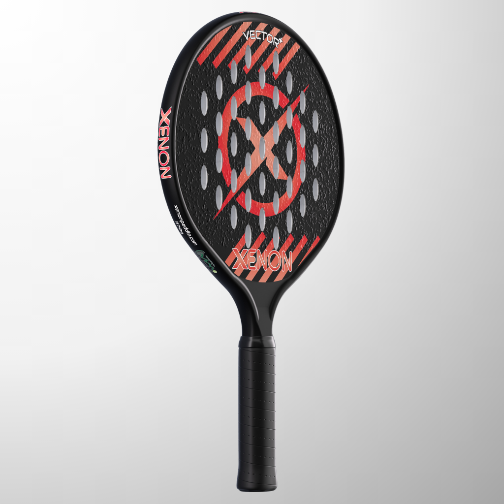 The complete line of Xenon platform tennis paddles. The Vector series with the oversize head, the Prime with the standard size head, the eVortex with the heated handle and the Vortex junior kids paddle.